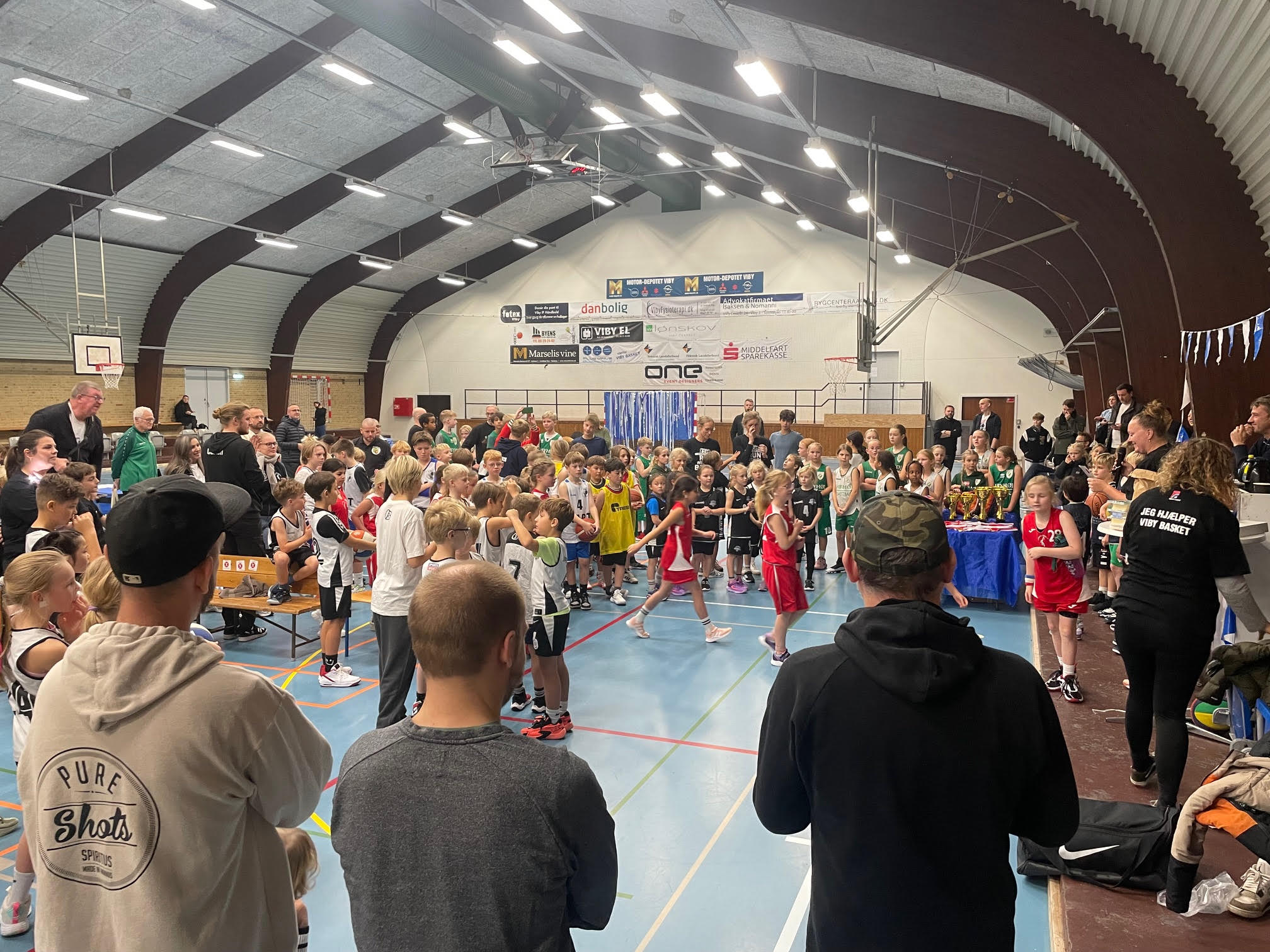 Stævneansvarlige bærer frivillige eller klub t-shirts fra Viby Basket.